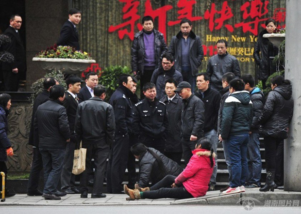 2月19日中午,长沙市八一路富丽华酒店门口,死者王某家属在酒店前讨要说法,随后被保安驱赶离开。