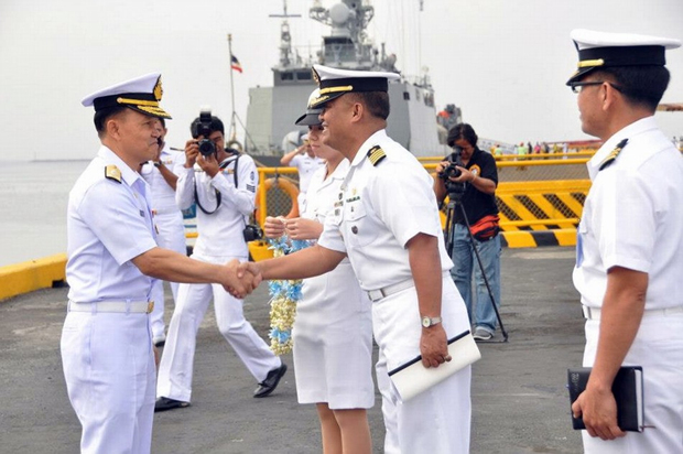 菲律宾海军官员在港口迎接来访的泰国皇家海军