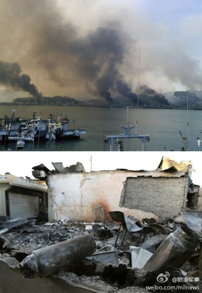 资料图:2010年延坪岛炮击事件中,冒起浓烟的韩国建筑。