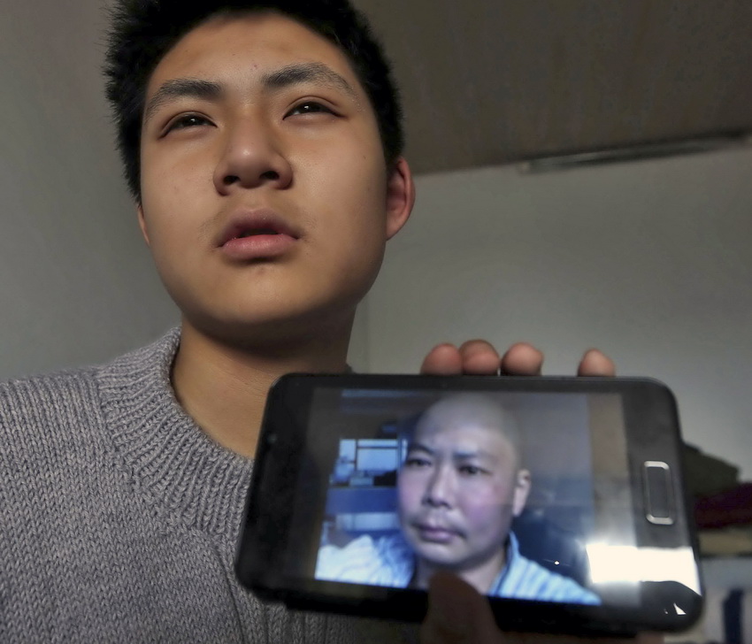 王一竹在苏州的临时租住房里展示父亲通过微信发来的病房里的自拍照片(2月26日摄)