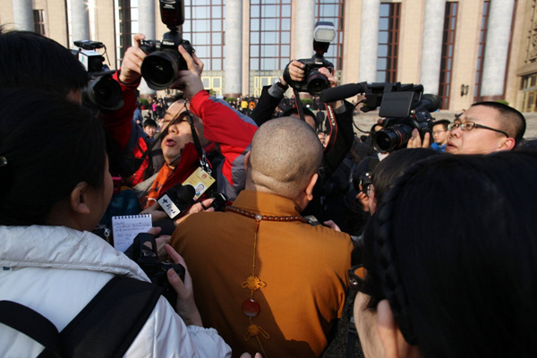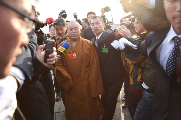 3月5日,北京,人大代表释永信在安保人员开道保护下步入会场